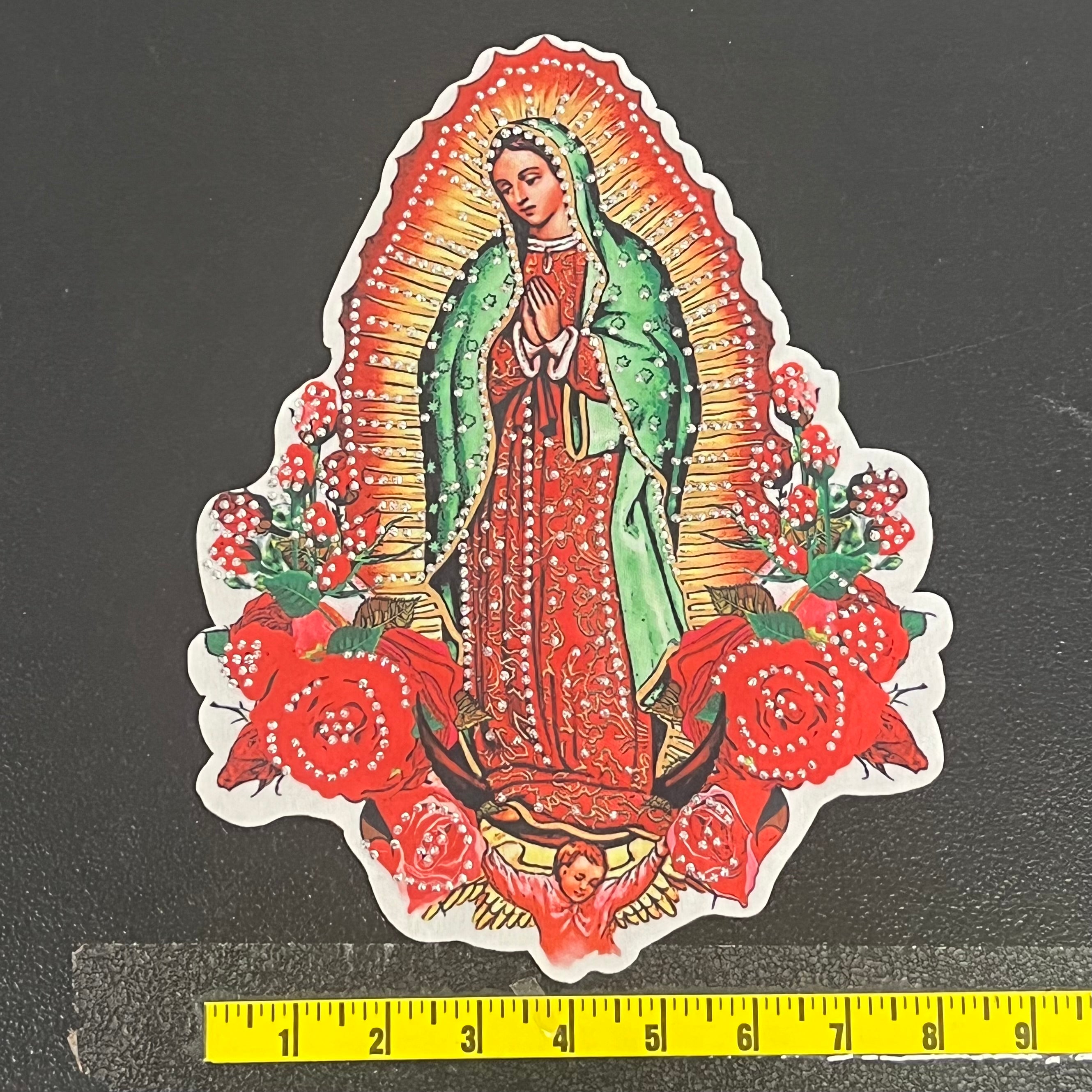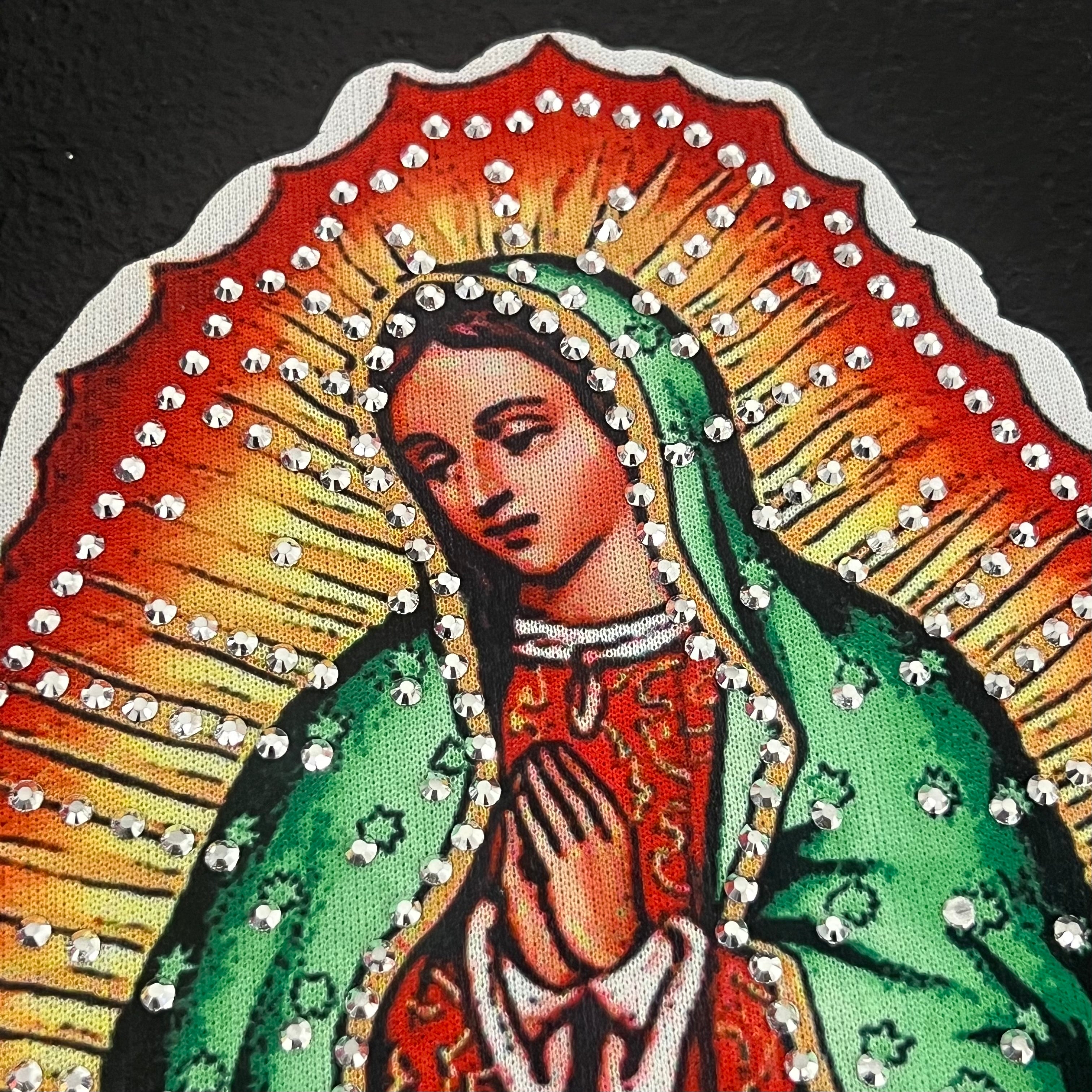 Bring your faith to life with this beautiful Virgen de Guadalupe iron-on patch, perfect for jackets, tote bags, clothing, and crafts. It features a full-color printed design on soft fabric, decorated with small sparkling rhinestones.