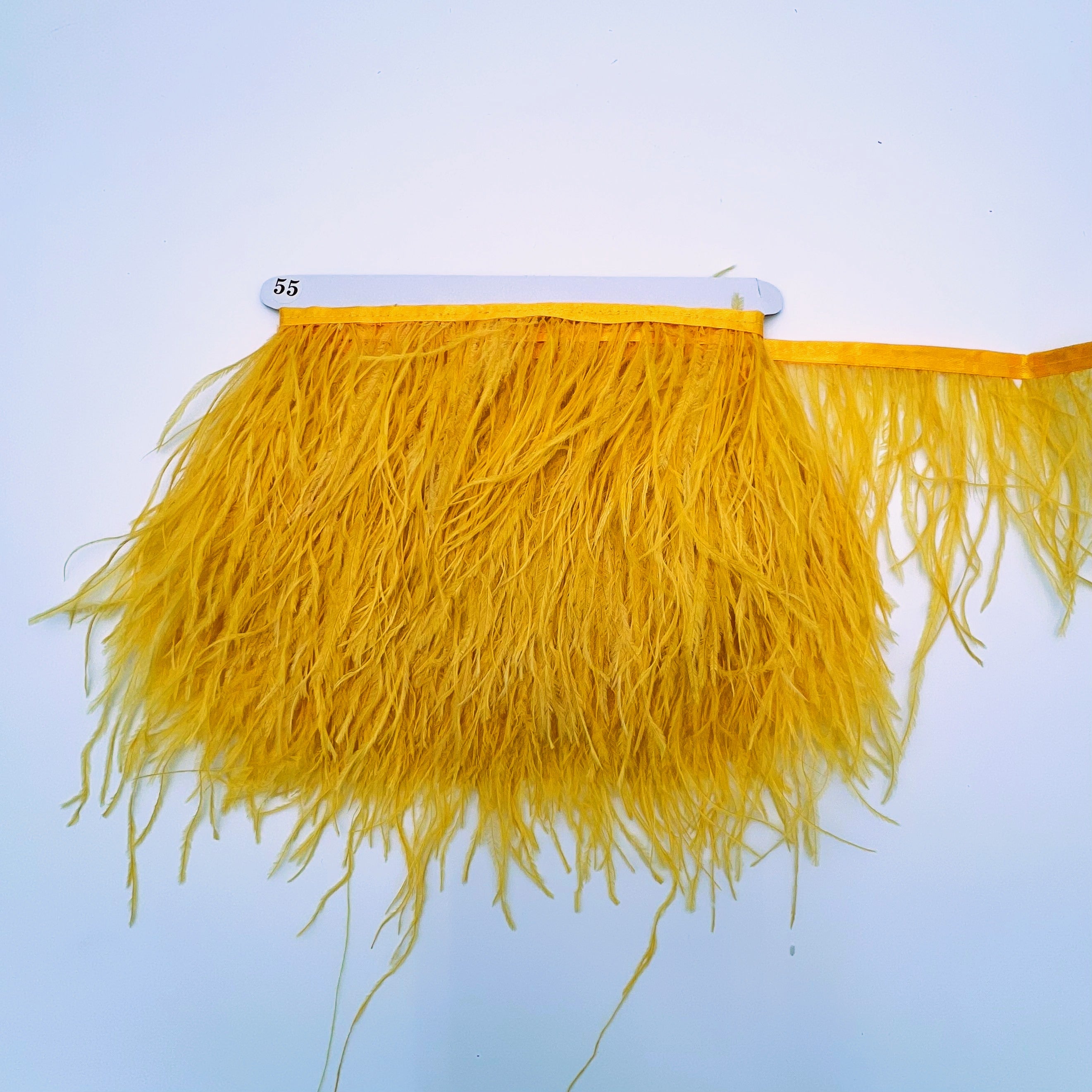 his luxurious ostrich feather trim adds dramatic movement, texture, and elegance to any design. Commonly used along hems, cuffs, and ankles, it’s perfect for elevating dresses, skirts, jackets, and performance costumes. Each pack includes 10 yards of soft, flowing ostrich feather trim, making it ideal for larger garments and statement designs.