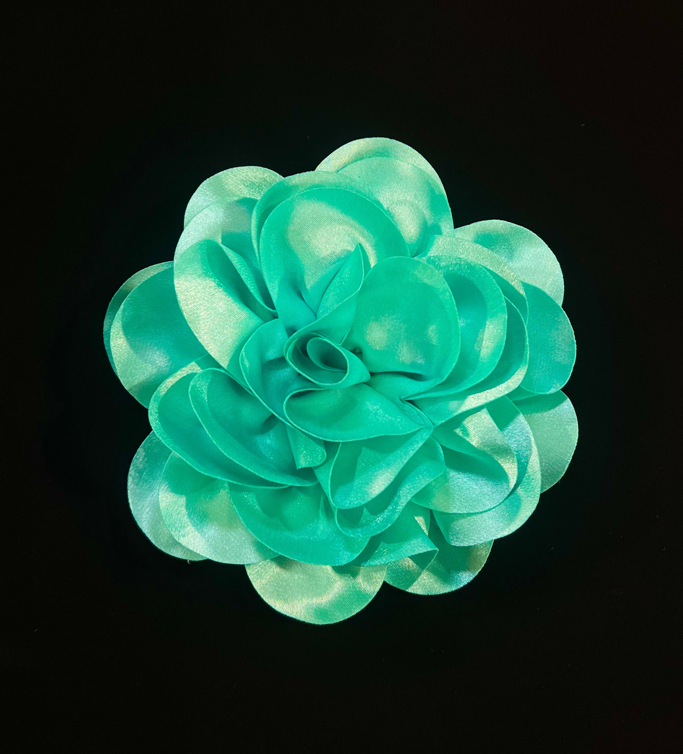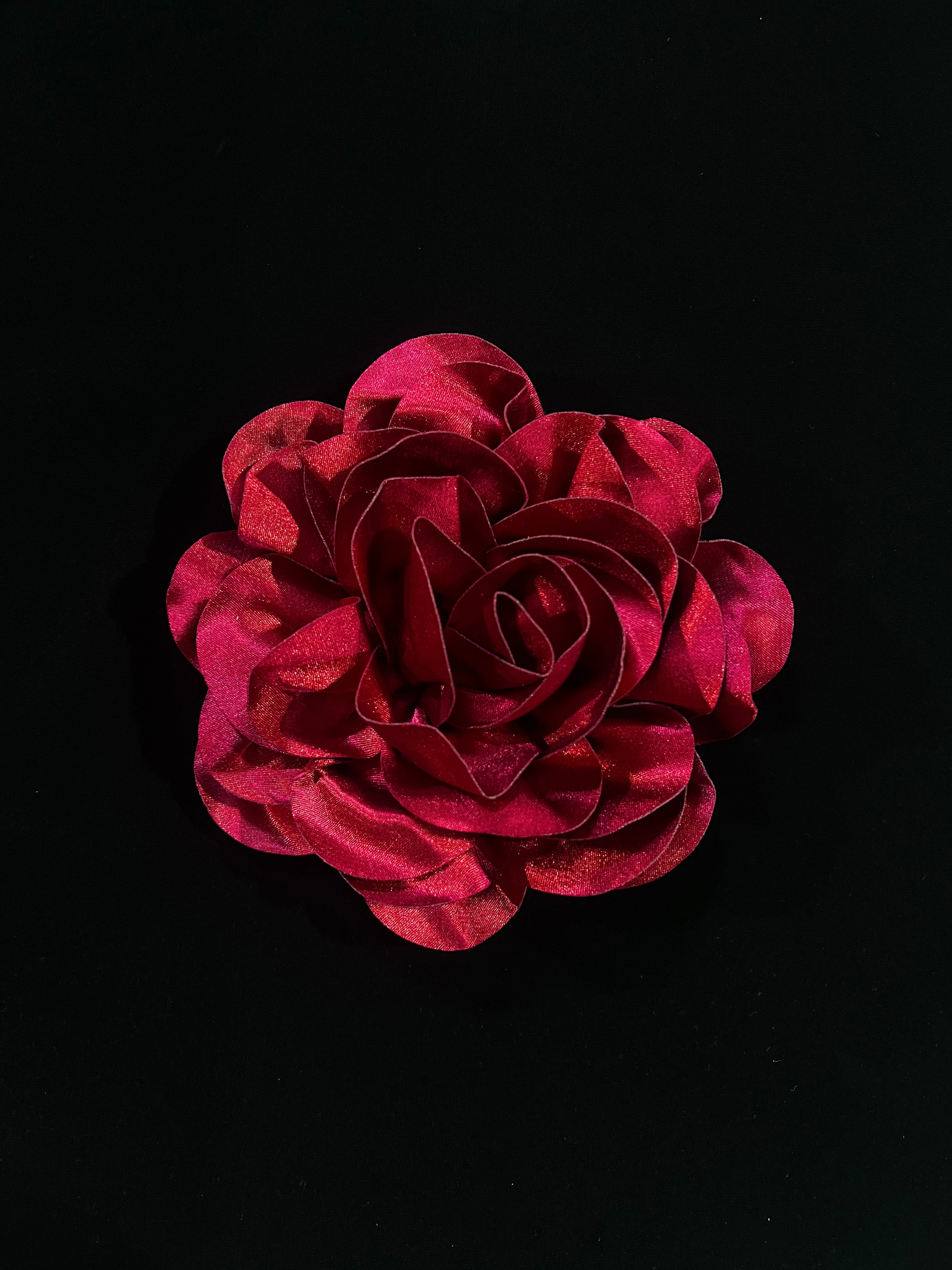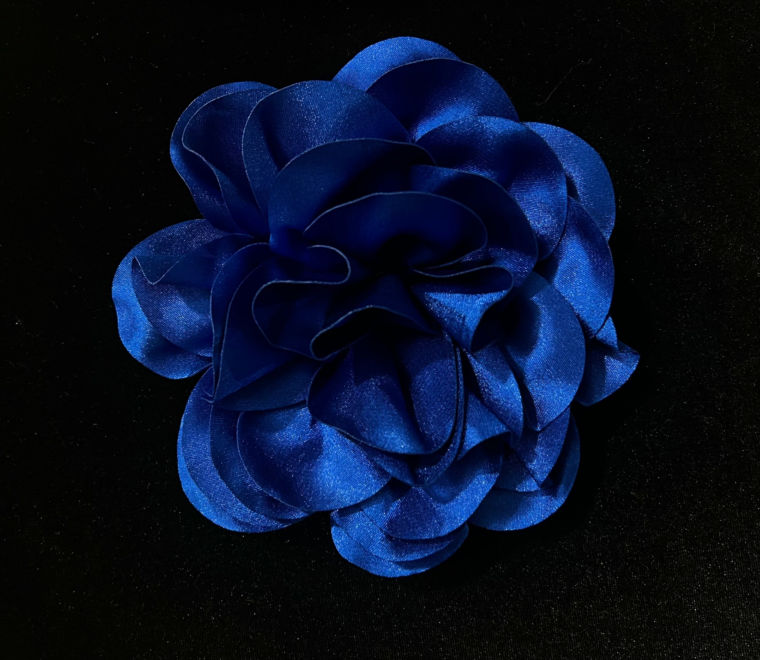 These satin flowers are approximately 7x7 inches and have a felt circle at the bottom side to be sewn to any garment.